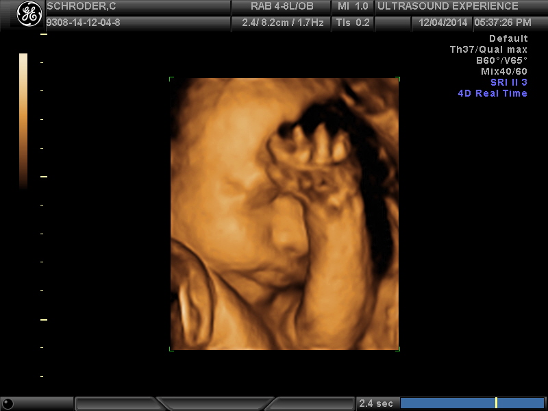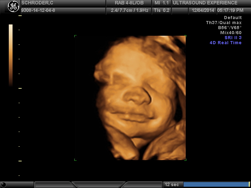 …and it was amazing. As if we couldn’t love you anymore…we do. Seeing your precious face in 4D was an incredible experience. We saw your facial features and they are so defined! You already have expressions that resemble mine and your dads and it was so awesome to see that đ You are unbelievably adorable with a full head of hair, pronounced nose and mouth and scrumptious cheeks. You were very active during the ultrasound and were wiggling around and moving your tiny hands and feet non-stop. You smiled for us and even threw up a peace sign…just like your mama đ