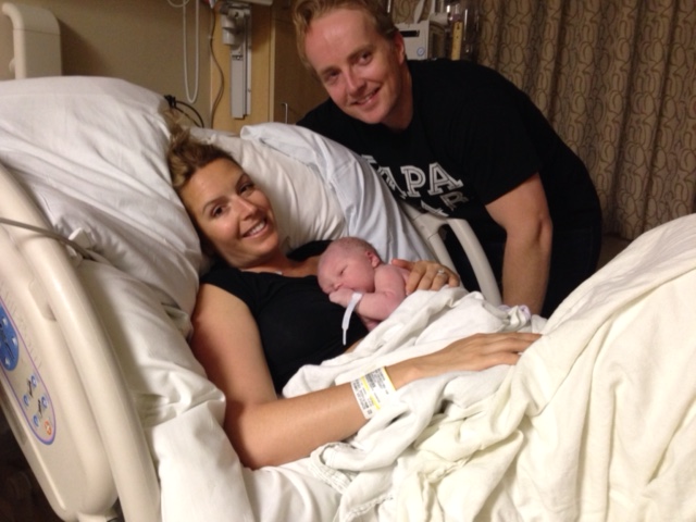 Off to the hospital we went and of course we didn’t do a hospital tour or pre-register like we were supposed to so there was a little confusion once we got there but finally we got checked into our room. By 3am, my parents had arrived and our nurse checked my dilation…I was only 3 cm which is exactly what I was the previous morning. The nurse suggested I stay on my feet and move around or bounce on a yoga ball as much as possible. As uncomfortable as I was, my mom, dad, Dan and I walked laps in and around the hospital…I was in the full getup…hospital gown, sticky footed hospital socks, birds nest in my hair, bags under my eye…I looked like I had escaped from the psych ward. Everytime a contraction came (which was about every 4 minutes) I had to grab on to a railing, trashcan, table, anything belly button level that was within reach…the contractions were painful and thank god for my dream team…each time they began my mama massaged my lower back as Dan helped me breathe through it and my dad kept me preoccupied by reminiscing about my birth and telling interesting stories. I thought by the time my doctor would arrive that I would be ready to push! My doctor arrived at 6am and checked me…no progress had been made, literally still 3 cm. SAD! For the next 8 hours we stayed moving…walking, bouncing, showering…everything that the nurses and doctor suggested. He came back around 2pm and checked again…nothing again…so he broke my water and stretched me to 6cm. After that, the contractions became unbearable and very frequent (lets just say the hypnobirthing techniques went out the window). He came back 4 hours later and checked again…I actually was less dilated, it was so disheartening. I had planned on doing a natural birth but after laboring for at least 20 hours without intervention, I was exhausted, bummed that I wasn’t progressing on my own and ready to meet you, Vaughn! My doctor told me he would start me on pitocin and I knew that it was time for some pain medication. After much debate, I got an epidural drip along with pitocin and within minutes I couldn’t feel the contractions at all. Within an hour I was fully dilated. Since the epidural numbed me so well, I couldn’t feel my lower half enough to push so they had to remove it which was a bummer as it felt pretty amazing to be numb. While I was waiting for it to wear off I actually napped…the first time I slept in 2 days. By 10 pm I could feel my legs again and it was time to push. Two hours of pushing to Fleetwood Mac in a dark room with Dan holding my left leg and George (our nurse) holding my right leg, our awesome doctor delivered you at 12:19am on Friday the 13th. It was the best day of our lives.